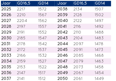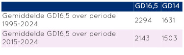 In onderstaande tabel zijn de gemiddelde graaddagen gegeven op basis van het KNMI'23 MD scenario. Het gemiddelde heeft betrekking op de 30 jaren om het betreffende jaar heen.